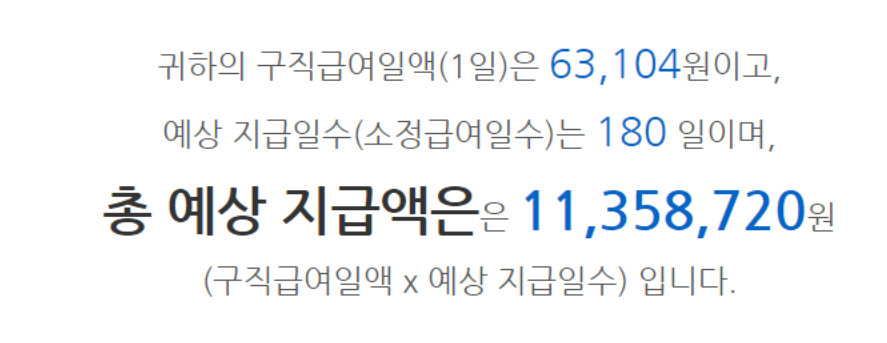 결론적으로 실업급여 하한액 63,104원에다가 소정일수 180일을 곱하면 11,358,720원입니다.
