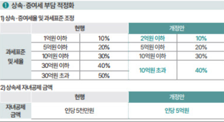 짧게 요약하자면 상속세율과 면세 범위 조정하고 상속세 면제 한도액 중에서 자녀공재액을 5천만 원에서 5억 원으로 크게 확대해서 부담을 줄인다는 내용입니다.