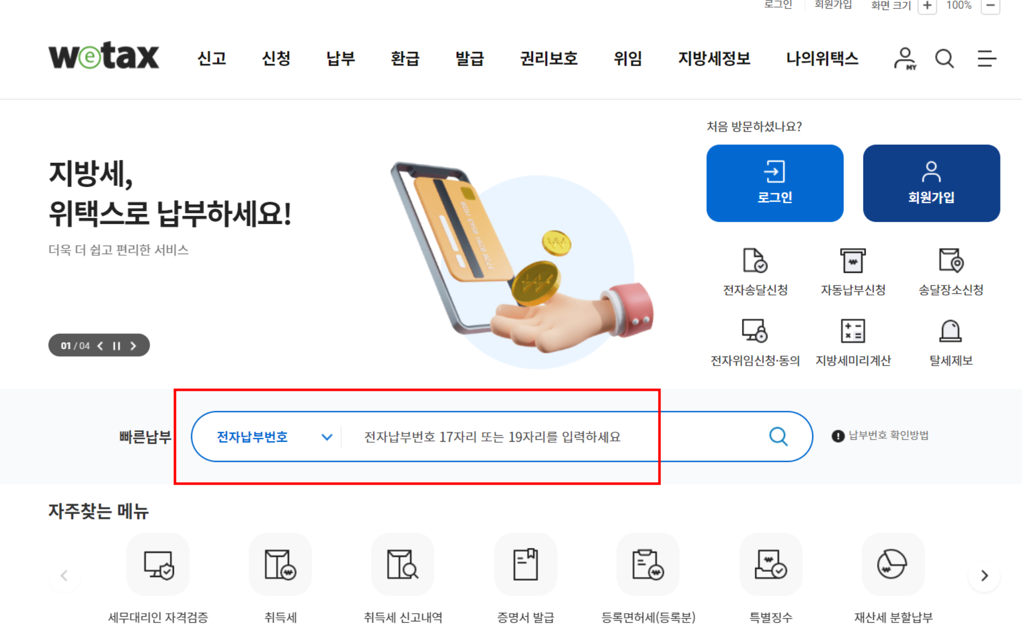 위택스를 사용할 수도 있습니다. 위에 공유드린 홈페이지에 접속하면 빠른납부가 있는데요. 고지서에 기재된 전자납부번호를 입력하여 온라인으로 납부할 수 있습니다.