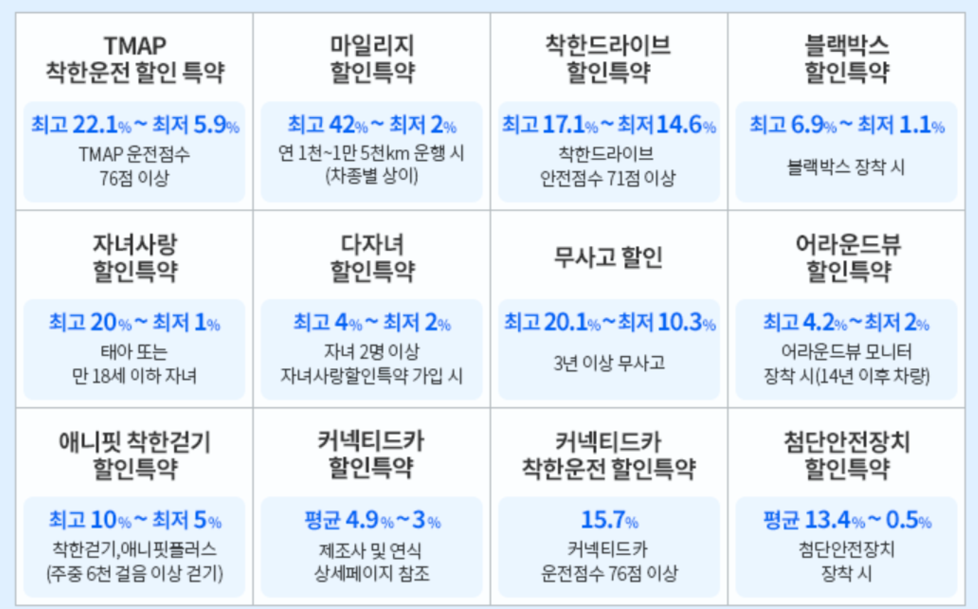 - 마일리지, 블랙박스, 자녀 할인 특약 등을 추가하여 보험료를 더욱 할인받을 수 있습니다.