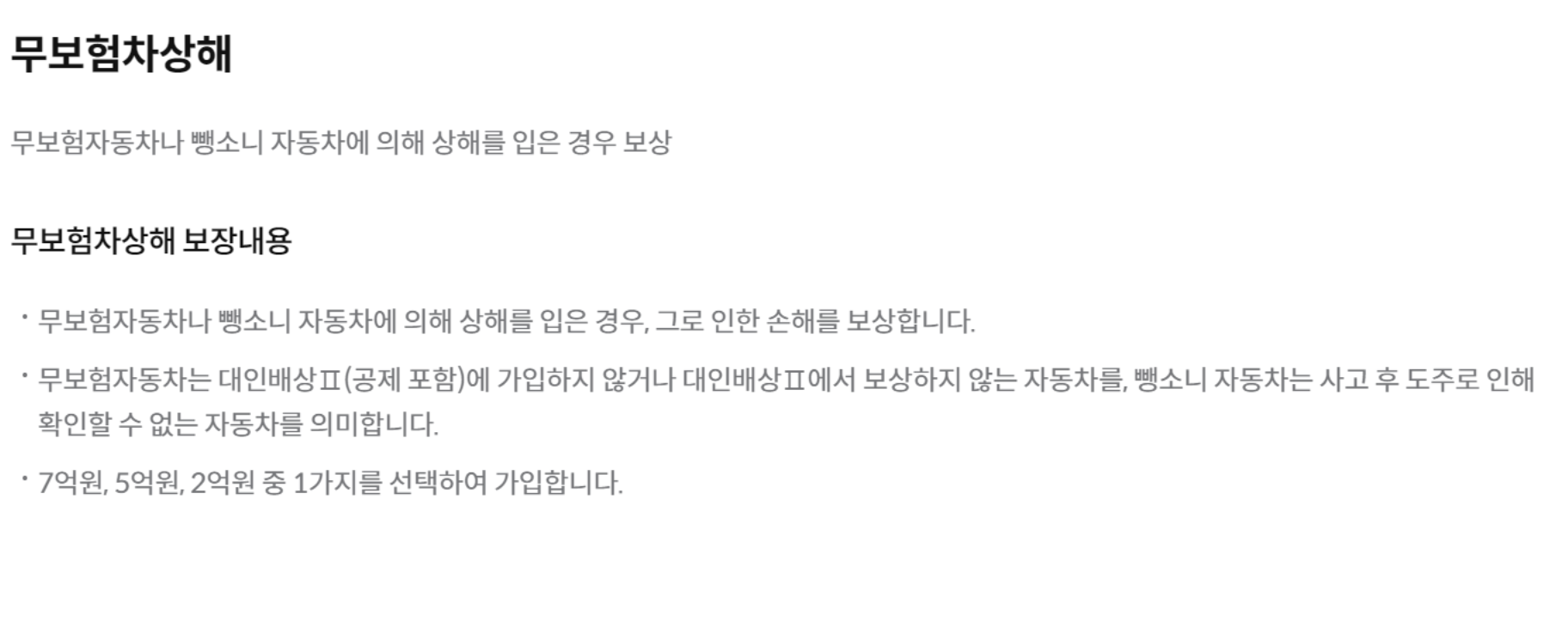- 무보험차 상해: 무보험 차량이나 뺑소니 차량으로 인해 상해를 입었을 경우 보상합니다.